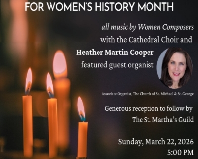 The program for Women’s History Month features all women composers with the Cathedral choir and Heather Martin Cooper, featured guest organist, the Associate Organist from The Church of St. Michael & St. George.